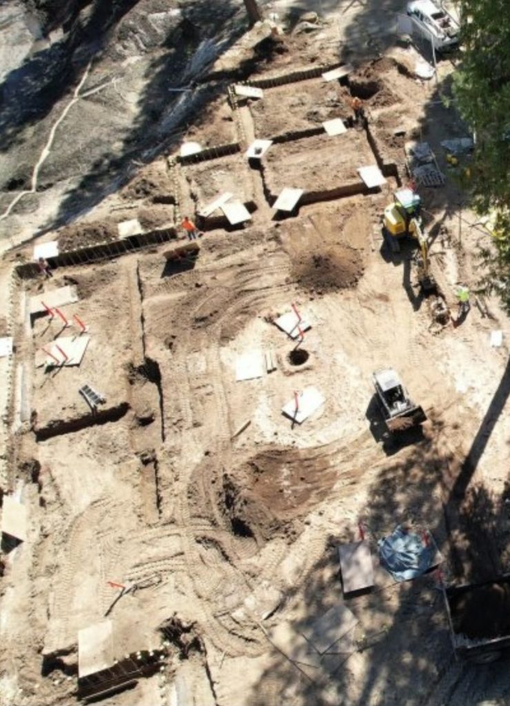 The New Dining Hall and Chapel project construction is still ongoing. A few weather delays pushed us back a few weeks, but we’re in what I’m calling the “waffle” stage right now. The grade beams are being dug and filled in with rebar and concrete. Grade beams are concrete beams constructed in the ground (dug out and filled) and to me at least, resemble the ridges of a waffle. Once these are in place, they will begin the primary foundation pour. In summary, the in-ground pillars are done, the waffle stage is ongoing, and the main foundation pour will happen shortly after. With our updated time-frames we hope to have the full foundation complete by May 28th.