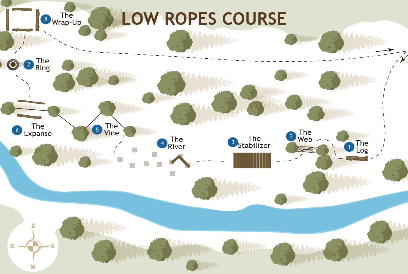 Located below the pool and just north of Vertigo, the low ropes course offers six unique and challenging activities for groups of up to ten people.